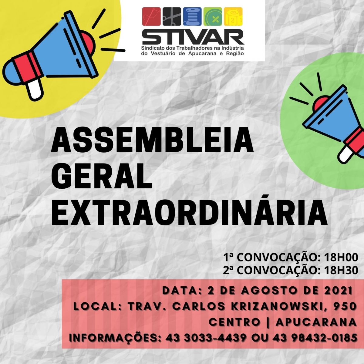 O Sindicato dos Trabalhadores nas Indústrias do Vestuário de Apucarana e Região (Stivar) realiza nesta segunda (02) uma Assembleia Geral Extraordinária na sede da entidade.