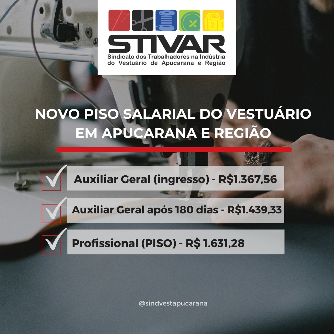 O Sindicato dos Trabalhadores na Indústria do Vestuário de Apucarana e Região (Stivar) divulgou nesta terça-feira (14) a nova tabela salarial dos trabalhadores da categoria. Os salários foram definidos após as negociações entre o Stivar e o Sindicato das Indústrias do Vestuário do Vale do Ivaí (Sivale).